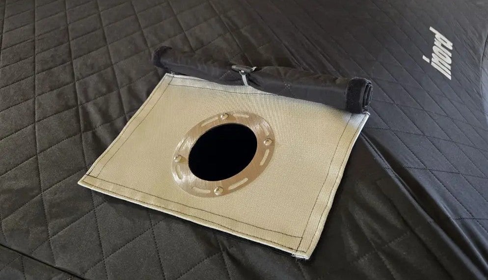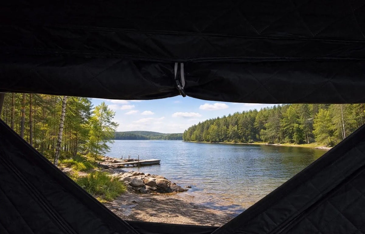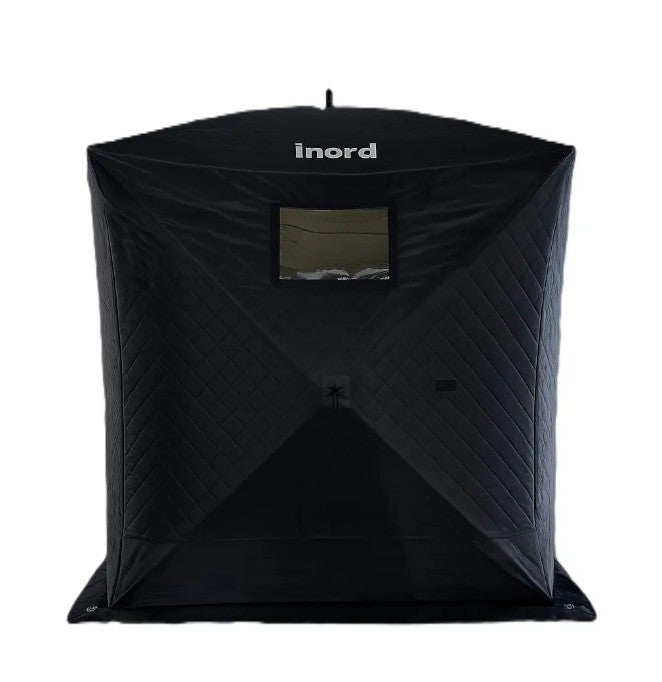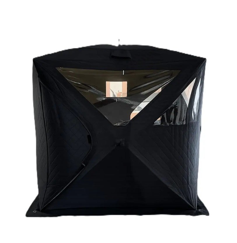 Saunateltta, musta sisäpuoli. Lähes suorat seinät tuovat sisälle paljon tilaa, musta mattapintainen sisusta ja ulkokuori. Tukeva runko on valmistettu lasikuidusta. Paksu kolmikerroksinen kangas pitää lämmön sisällä myös pakkasella. Monta käyttövaihtoehtoa, voidaan käyttää saunatelttana tai pilkkitelttana, myös asumiskäytössä!