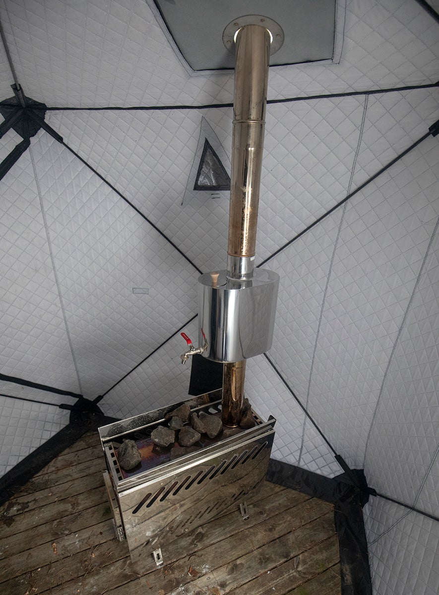Piipun läpivienti on tilaa säästävästi hiukan sivussa joten kiuas ei asemoidu aivan keskelle telttaa säästäen lattiatilaa istujille.