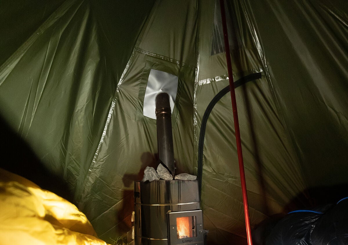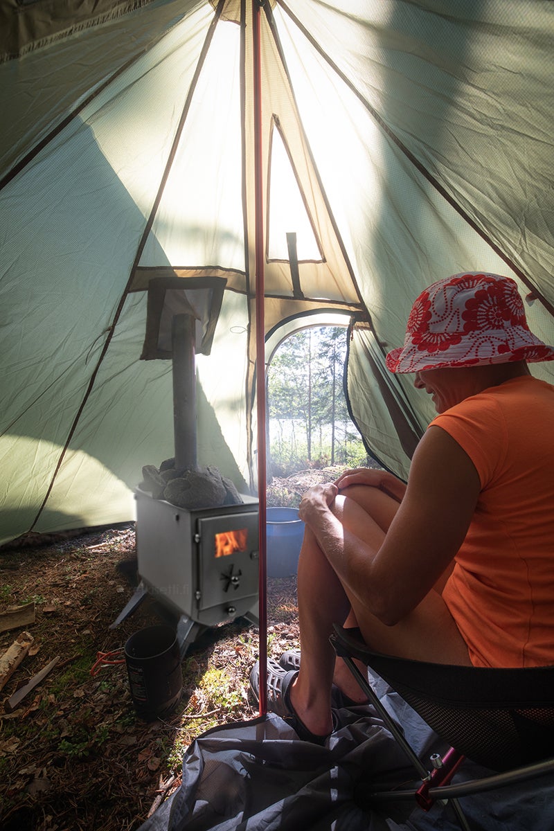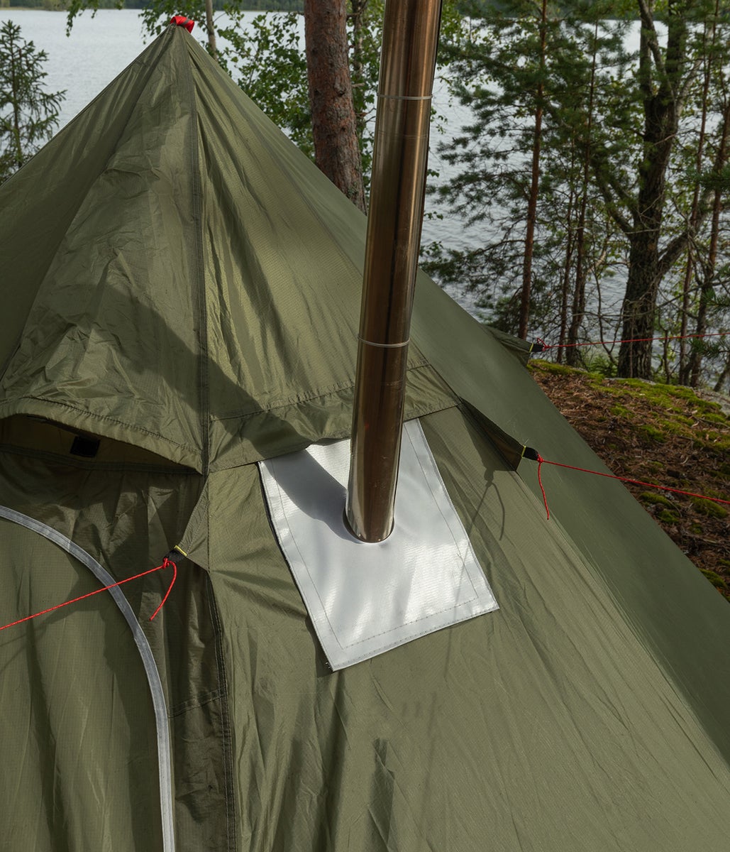 Kotateltta lumiliepeillä 2-3 hengelle 1,8kg Vihreä. Kamiinan kanssa käytettynä telttaan mahtuu 2 ihmistä, ilman kamiinaa kolme.